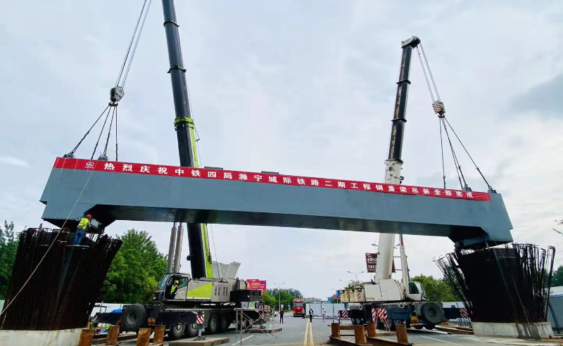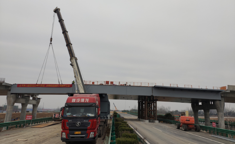 滁来全快速通道全椒段与滁马高速公路互通立交工程桥宽19m,长55m,箱体钢材材质为Q345qD,总重量575.83吨;单节段最重47.19吨。 -