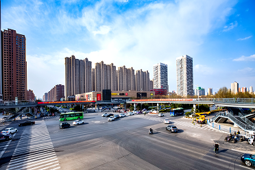 新乡市金穗大道与新二街交叉口人行天桥该项目位于新乡市金穗大道与新二街交叉口,主桥跨越金穗大道和新二街,总长度369m、宽度4.5m,人行梯道宽度3.5m,跨越金穗大道的主桥长约77m,跨越新二街的主桥约55m,四角用弧形连接。交叉口南侧为宝龙城市广场。 -